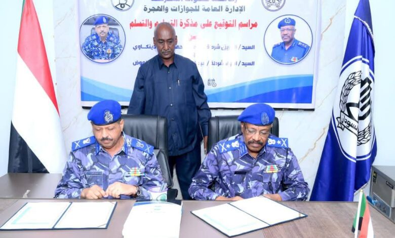 شهدت رئاسة الإدارة العامة للجوازات اليوم مراسم التسليم والتسلم بين الفريق شرطة حقوقي / عثمان محمد الحسن دينكاوي، واللواء شرطة / عبد المحمود العوض الذي تولى مهام مدير الإدارة العامة للجوازات، وذلك بحضور عدد من الضباط ومنسوبي الإدارة.