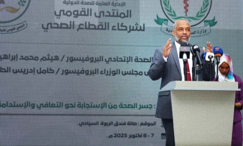 واشار خلال مخاطبته المنتدى القومي لشركاء القطاع الصحي الذي انعقد ببورتسودان، إلى التنسيق الوثيق مع الشركاء في تأهيل المرافق الصحية وتوفير الدواء.