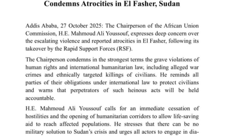 وقد أدان رئيس مفوضية الاتحاد الإفريقي، السفير محمود علي يوسف، بأشدِّ العبارات الانتهاكات الجسيمة لحقوق الإنسان والقانون الإنساني الدولي التي ارتكبتها قوات الدعم السريع بمدينة الفاشر عقب سيطرتها عليها، معبّراً عن بالغ قلقه إزاء تصاعد أعمال العنف ضد المدنيين العزل، وأكد يوسف أن ما شهدته الفاشر من جرائم قتل ممنهج واستهداف عرقي يرقى إلى جرائم حرب تستوجب المساءلة، مشدداً على أن مرتكبي تلك الفظائع لن يفلتوا من العقاب، كما دعا إلى وقف فوري للعدائيات وفتح ممرات إنسانية عاجلة لإيصال المساعدات إلى المتضررين، مبيناً أنه لا حل عسكرياً للأزمة السودانية، ومجدداً تضامن الاتحاد الإفريقي الكامل مع الشعب السوداني ودعمه لتطلعاته نحو السلام والوحدة والديمقراطية.