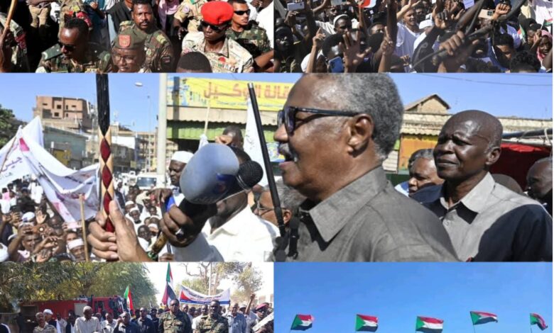 خرج الآلاف إلى الشوارع والساحات في أنحاء ومدن متفرقة بالبلاد لنصرة القوات المسلحة وتنديدا بأنتهاكات مليشيا الدعم السريع.