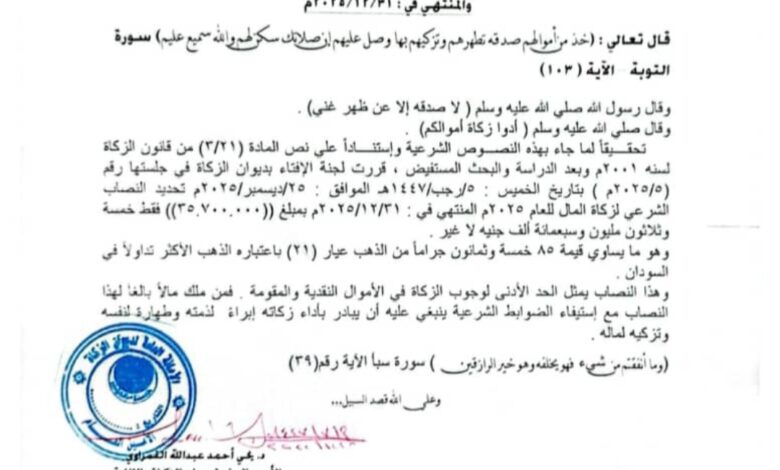 وأوضح المنشور أن النصاب الشرعي لزكاة المال يعادل قيمة (85) جراماً من الذهب عيار (21)، باعتباره الأكثر تداولاً في السودان، وقد تم تحديد قيمته النقدية بمبلغ (3,570,000) جنيه سوداني، باعتباره الحد الأدنى لوجوب الزكاة في الأموال النقدية والمدخرة.