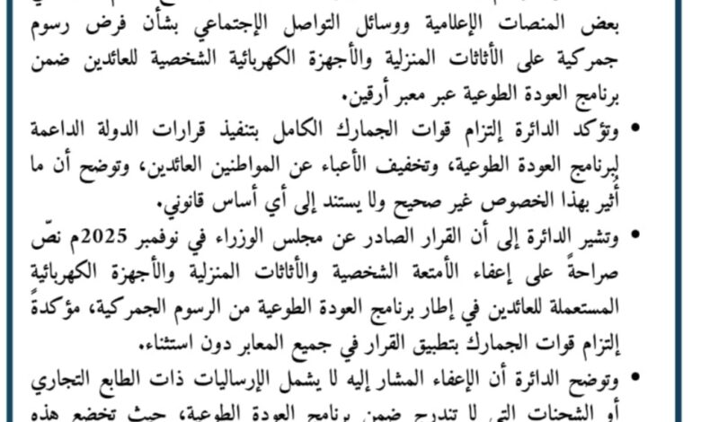 وتوضح الدائرة أن الإعفاء المشار إليه لا يشمل الإرساليات ذات الطابع التجاري أو الشحنات التي لا تندرج ضمن برنامج العودة الطوعية، حيث تخضع هذه الإرساليات للإجراءات والرسوم الجمركية وفقًا للقوانين واللوائح المعمول بها.