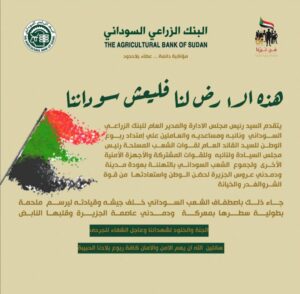 يتقدم السيد رئيس مجلس الادارة والمدير العام للبنك الزراعي السوداني ونائبه ومساعديه والعاملين على امتداد ربوع الوطن بالتهنئة للسيد رئيس مجلس السيادة الانتقالى القائد العام لقوات الشعب االمسلحة ولنائبه وللقوات المشتركة والاجهزة الامنية الأخرى ولجموع الشعب السوداني بعودة مدينة ودمدني عروس الجزيرة لحضن الوطن واستعادتها من قوي الشر والغدر والخيانة .