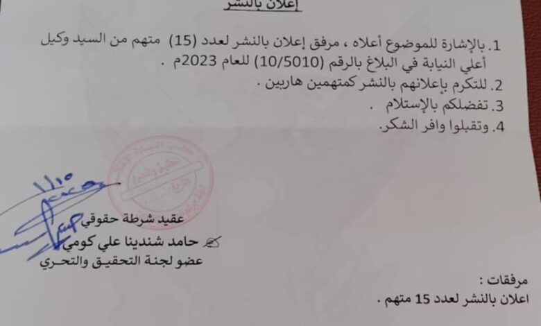 النيابه تصدر أوامر بالقبض عليهم،، (15) متهم في جرائم وانتهاكات للقانون الوطني والدولي الإنساني