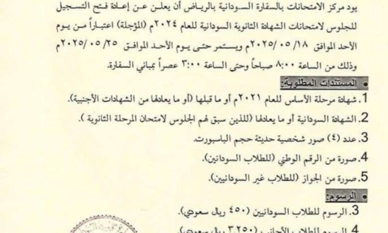 اعلن مركز الامتحانات بالسفارة السودانية بالرياض بالمملكة العربية السعودية عن إعادة فتح التسجيل للجلوس لامتحانات الشهادة السودانية للعام 2024 المؤجلة اعتبارا من يوم الأحد الموافق 18 وحتى يوم الأحد الموافق 25 من مايو الجارى من الساعة الثامنة صباحا وحتى الثالثة عصرا بمباني السفارة
